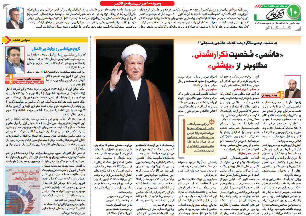 زنده یاد «آیت ا... هاشمی رفسنجانی» شخصیتی است که در تاریخ پرفراز و نشیب معاصر ایران خوش درخشید و عمر پر برکتش را در راه مبارزه با ظلم و ظالم و خدمت به نظام و مردم صرف نمود و سرانجام خورشید وجودش در غروب ۱۹ دی ماه به حکم آیه "همه از خداییم و به سوی او باز می گردیم" روی درنقاب خاک کشید و به قول معروف بار بربست و به گردش نرسیدیم و برفت.