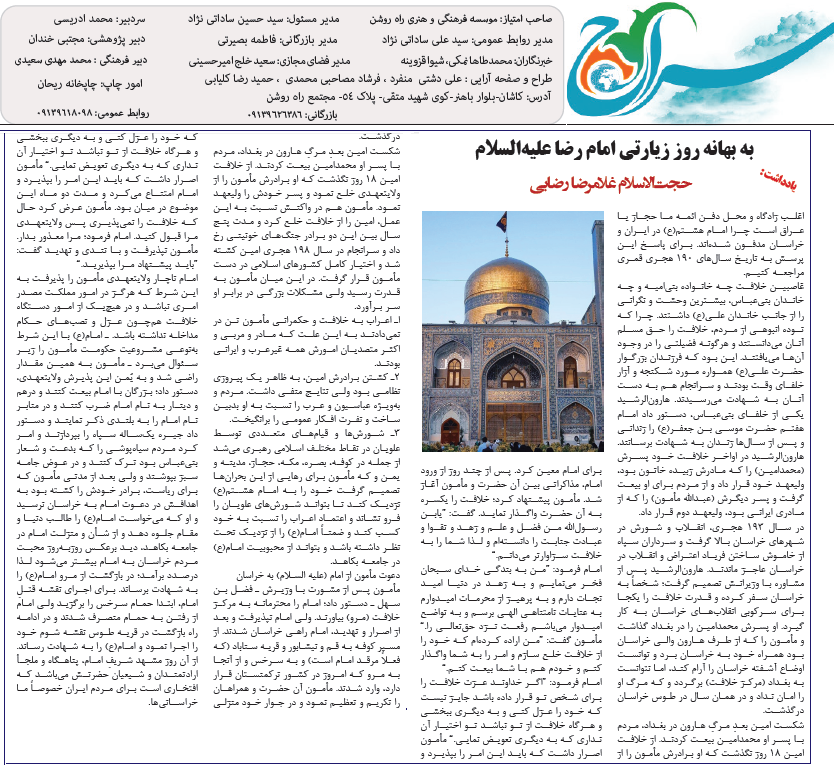 🔻امام ناچار ولایتعهدی مأمون را پذیرفت به این شرط که هرگز در امور مملکت مصدر امری نباشد و در هیچیک از امور دستگاه خلافت همچون عزل و نصبهای حکام مداخله نداشته باشد. ـ امام(ع) با این شرط بهنوعی مشروعیت حکومت مأمون را زیر سئوال میبرد ـ مأمون به همین مقدار راضی شد و به یُمن این پذیرش ولایتعهدی، دستور داد؛ بزرگان با امام بیعت کنند و درهم و دینار به نام امام ضرب کنند و در منابر نام امام را به بلندی ذکر نمایند و دستور داد جیره یکساله سپاه را بپردازند و امر کرد مردم سیاهپوشی را که بدعت و شعار بنیعباس بود ترک کنند و در عوض جامه سبز بپوشند و… ولی بعد از مدتی مأمون که برای ریاست، برادر خودش را کشته بود به اهدافش در دعوت امام به خراسان نرسید و او که میخواست امام(ع) را طالب دنیا و مقام جلوه دهد و از شأن و منزلت امام در جامعه بکاهد، دید برعکس روزبهروز محبت مردم خراسان به امام بیشتر میشود لذا درصدد برآمد؛ در بازگشت از مرو امام(ع) را به شهادت برساند. برای اجرای نقشه قتلِ امام، ابتدا حمام سرخس را برگزید ولی امام از رفتن به حمام منصرف شدند و در ادامه راه بازگشت در قریه طوس نقشه شوم خود را اجرا نمود و امام(ع) را به شهادت رساند.